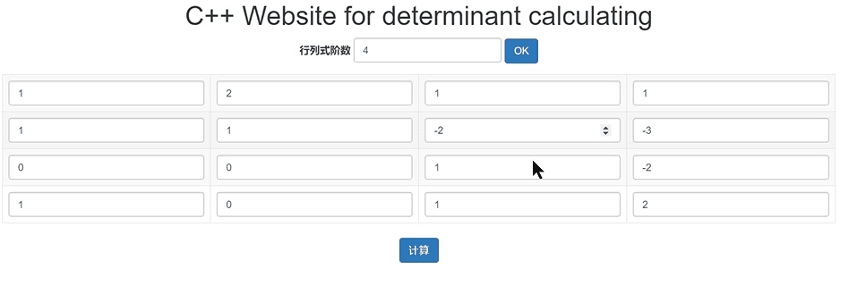 光说不练假把式,于是我们用C++网站做一个简单的行列式计算器。实际上小规模行列式用js求解效率就足够感人了,但为了突出C++的前后端交互,我们将用户的输入数据发送到后台,由C++计算并给出结果。