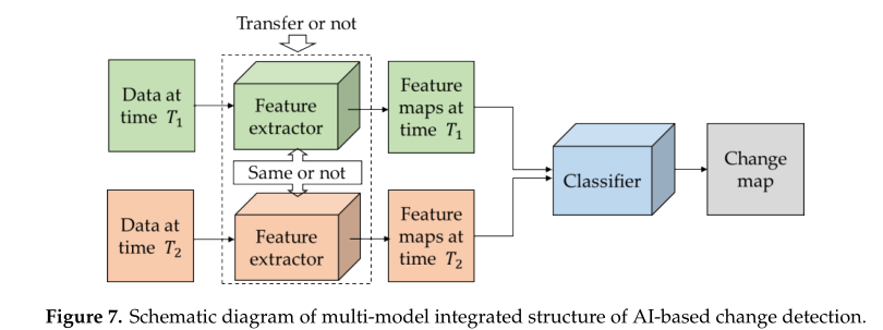 变化检测是一种时空分析,可以通过将基于AI的特征提取器作为光谱空间模块来获取空间-光谱特征,然后将基于AI的分类器作为时间模块来建模时间相关性。