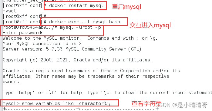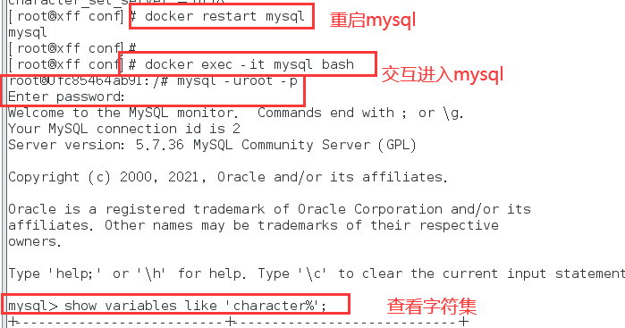 3.重新启动mysql容器实例再重新进入并查看字符编码