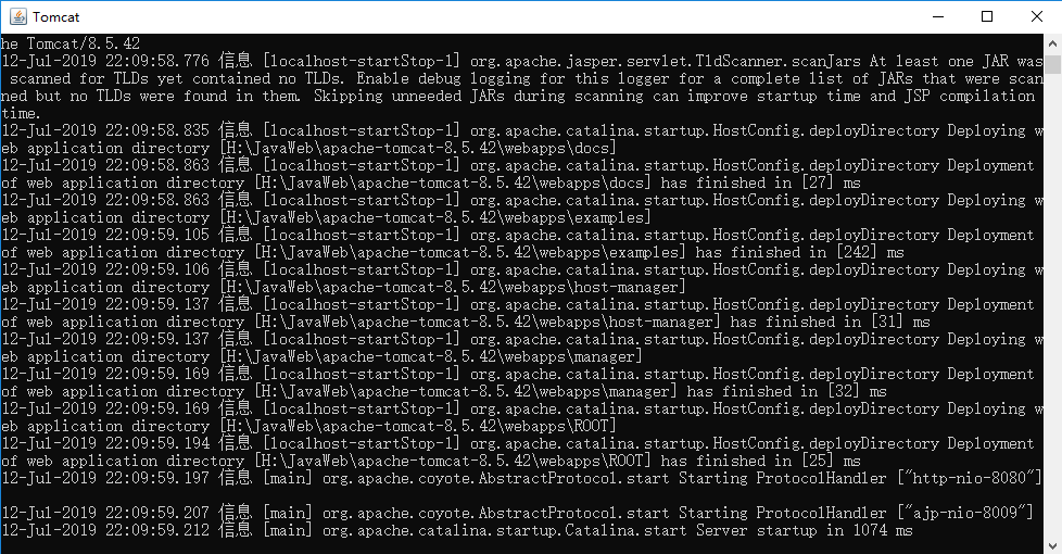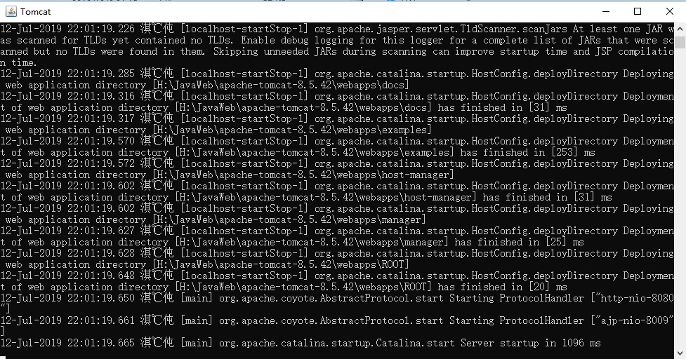 双击 \apache-tomcat-8.5.42\bin\startup.bat 文件启动Tomcat,Tomcat可以正常工作,但命令行显示中文字体是乱码的;