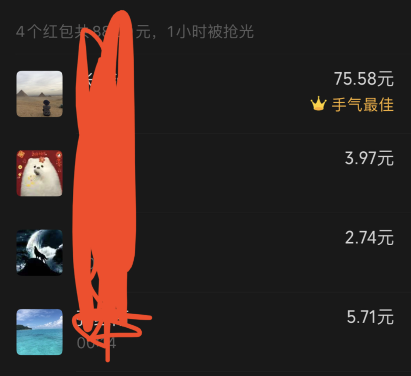 实际上微信群红包的算法虽然公平,但是有个缺陷,不过这个微信产品同学可以接受,只是对于用户来说体验并不是那么友好,因为有时发个群红包会出现下面这种最后一个红包金额非常大的情况。
