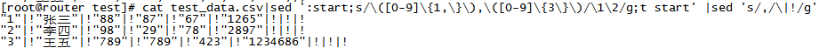 cat test_data.csv|sed 's/,,/"","",""/g'|sed 's/\([^0-9]\),/\1\|!/g'代码解释: