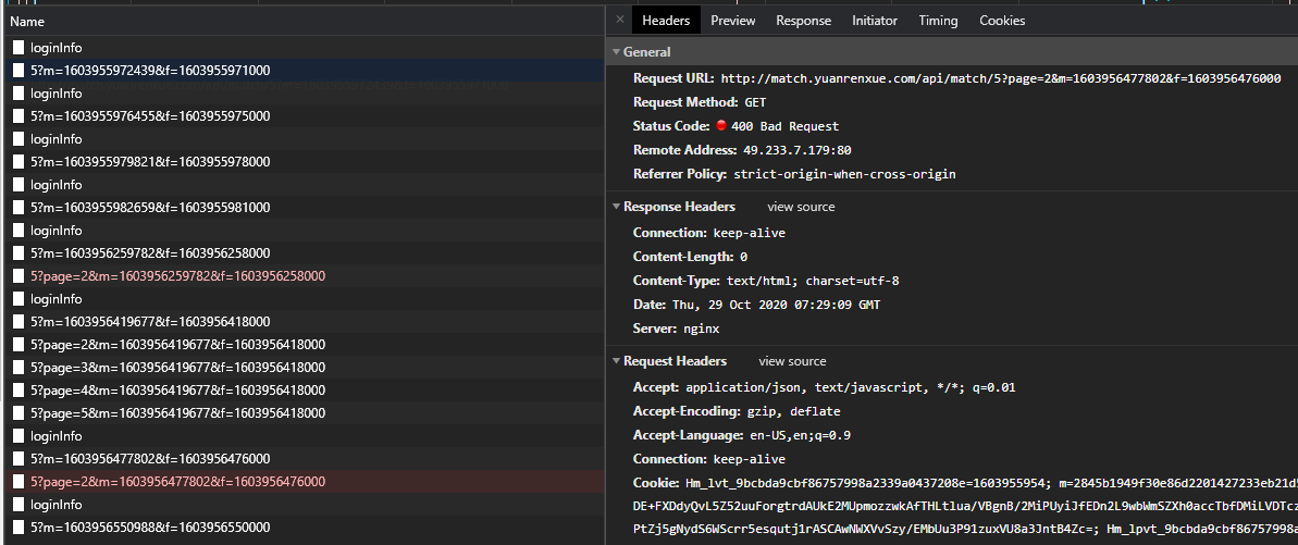 分析发现每页请求拿的都是同一个cookie&参数!!!如果cookie过期了那么就会返回400!!!