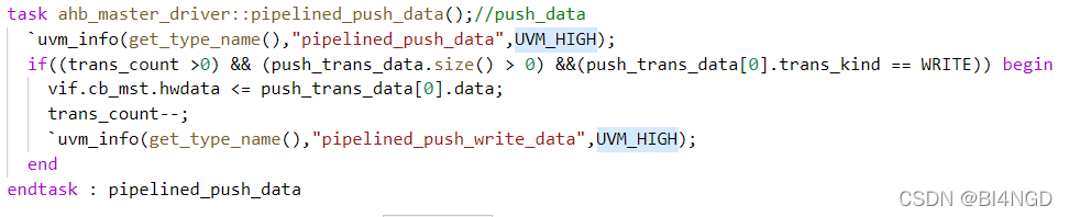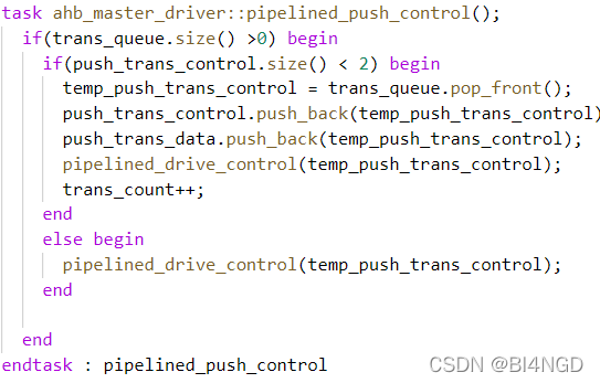 push_trans_control与push_trans_data分别用于“待完成”控制与数据的缓存,在存入队列的同时也进行控制信号的驱动。并将transcount++以表示数据信号可以驱动。