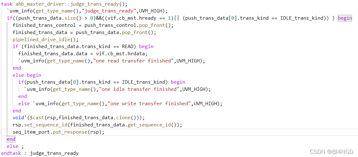 通过对hready信号以及“待完成”队列数量判断当前clk是否有trans完成了控制与数据的传输,当判断完成时,对“待完成”队列进行pop front并返回rsp。