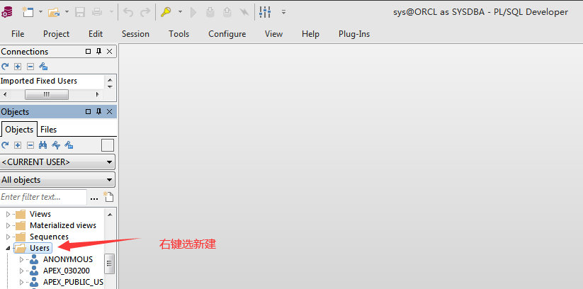 4、用sys管理员账号登录成功后,找到users目录文件夹,并鼠标右键,选择new(新建) ,并进入到创建user页面,填写用户名和密码和表空间等(或使用sql语句创建:Create user 用户名 indentified by 密码 default tablespace 需要的表空间名 temporary tablespace temp;),然后在点击role privileges,并选择相应角色,为当前创建的用户授权: