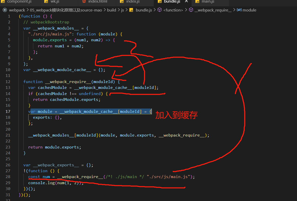 捋一下思路,webpack帮助我们对commonjs的模块化导出,打包成一个Bundl.js文件,她做了什么事呢?首先生成一个对象,这个对象有几个属性,属性名就是我们的模块路劲,属性值是什么呢?就是我们导出的东西,可能是一个函数也可能是一个值。第二步,内部定义一个对象,这个对象存放着所有加载过的模块的缓存。第三步,内部定义一个函数,这个函数就是用来处理我们记载模块的。第四步,就是使用立即指向函数,通过第三步定义的函数,取到我们实际上导出来的值或者函数,然后再直接调用。