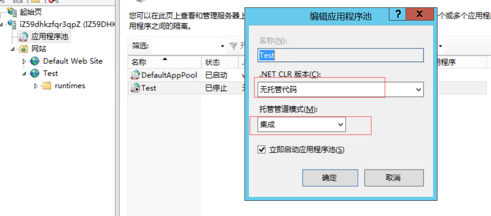 应用程序池配置:.NET CLR版本选择无托管代码 ,托管管道模式选择集成。