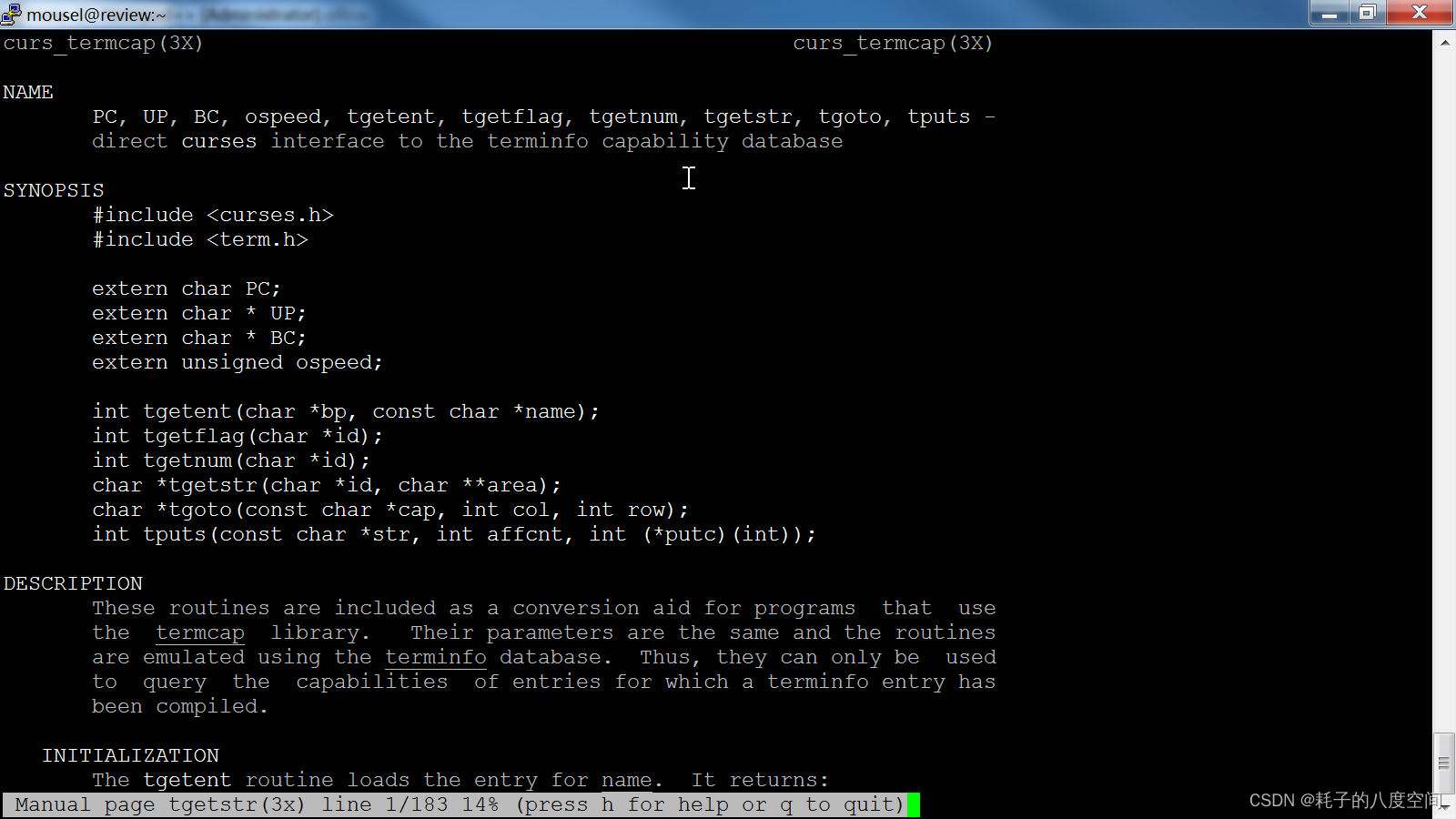 输入:man 3 tgetstr来查看该函数的使用帮助,如下所示,我们可以知道终端能力有3种,分别是布尔值、数字值和字符串值,而该函数是用来获取字符串值的终端能力。同时,我们也可以知道,这个函数是给使用termcap库的应用使用的,后台会转换为terminfo库中的值。termcap和terminfo都是描述终端能力的库,termcap出现的比较早,已经被terminfo取代,但为了兼容性,termcap的接口仍然保留。