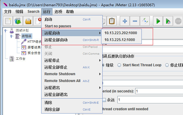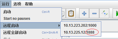 3、打开Jmeter,选择运行,有运程启动、运程全部启动两个选项:
