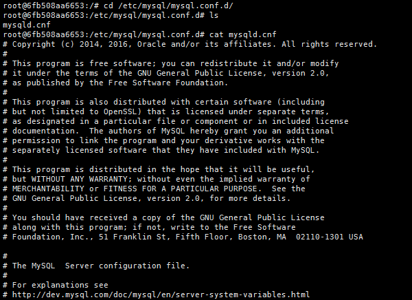 docker cp test:/etc/mysql/mysql.conf.d/mysqld.cnf /root/mysqld.conf