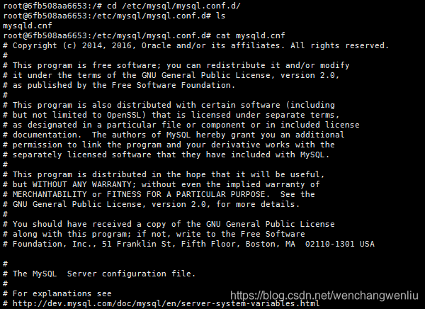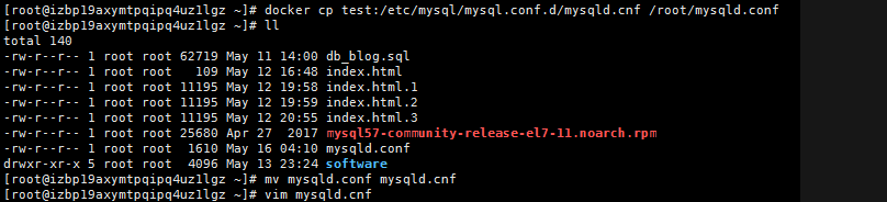 由于是docker容器的mysql,不能直接用vi/vim打开,需要复制出来