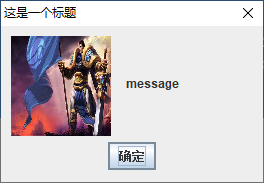 JOptionPane.showMessageDialog(null, "message", "这是一个标题", JOptionPane.CANCEL_OPTION, new ImageIcon(