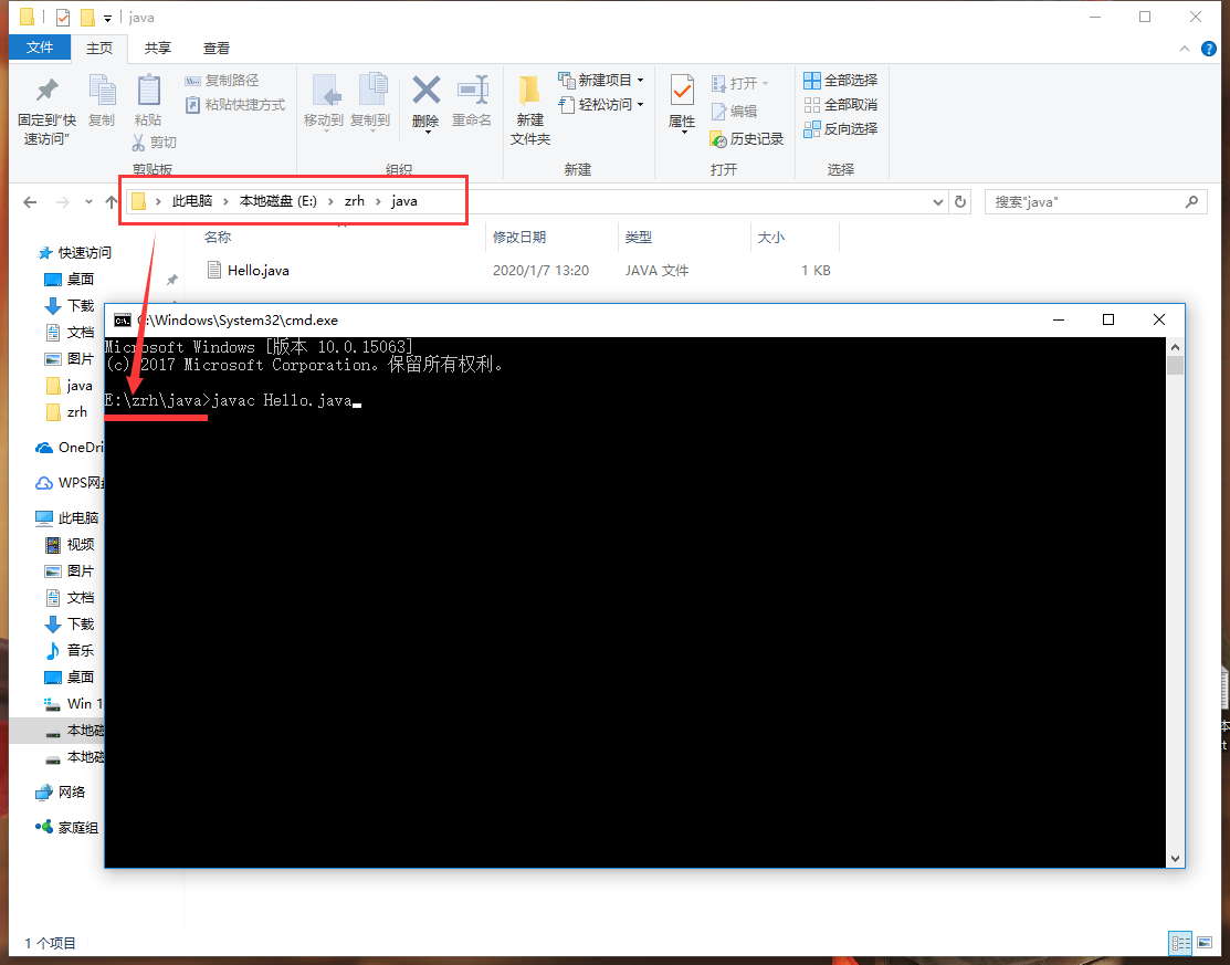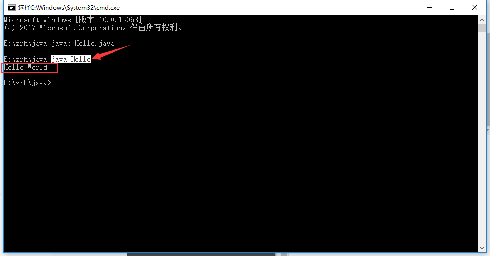 1.进入命令行界面,进入到上面编写的java文件所在的目录,然后输入javac Hello.java 编译产生字节码文件