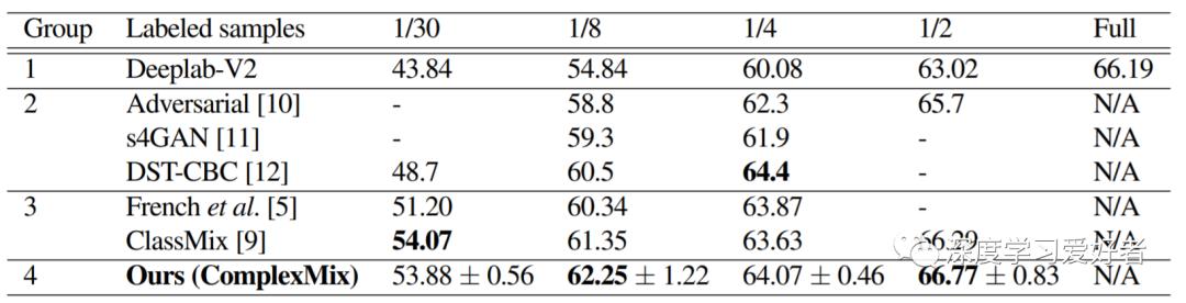 本文提出的方法属于对无监督混合样本进行一致性预测的范畴。作者提出了一种更有效的基于掩码的分割地图扩展策略,称为ComplexMix,以解决半监督语义分割问题。作者假设在增加语义上正确的增广的复杂性中有附加价值,因此试图产生语义上正确的复杂增广。作者将一幅图像的分割图分割成几个相同大小的正方形,并根据当前模型预测每个正方形中的语义标签。遵循ClassMix[9]的扩展策略,然后作者在每个正方形中选择预测类的一半,并将它们粘贴到扩展图像上,以形成尊重语义边界的新扩展。加法的复杂度是由初始分割时产生的平方数控制的。实验结果表明,所提出的ComplexMix增强方法优于随机增强或简单的语义正确增强技术。