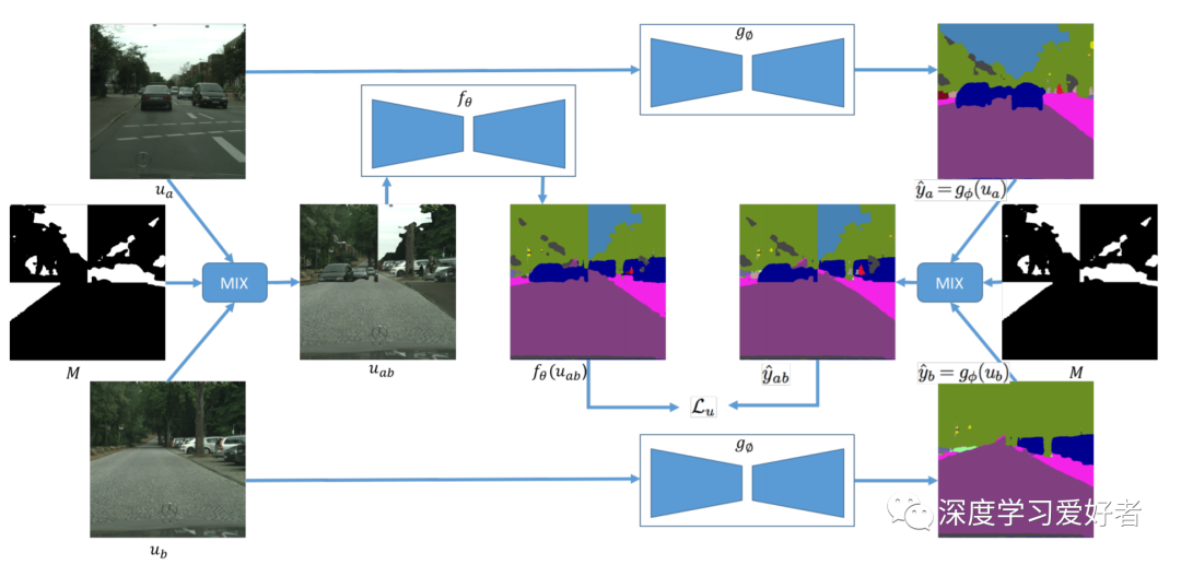 作者提出的通过基于掩码的数据增强的半监督分割方法。作者的方法采用了刻薄教师策略。该网络的顶部和底部分支属于训练有素的教师,以产生语义分割预测,而中间分支属于学生,学生试图匹配教师的混合预测与自己基于混合图像输入的预测。