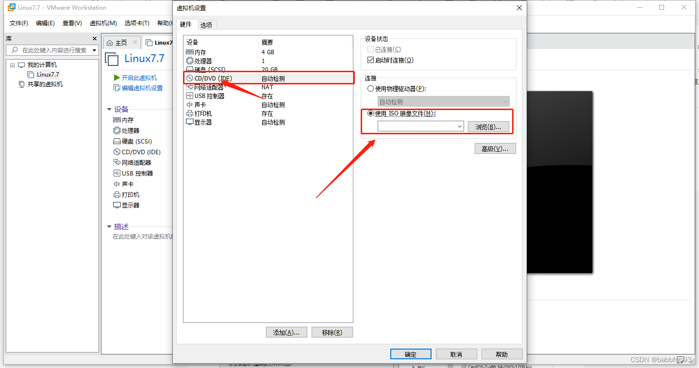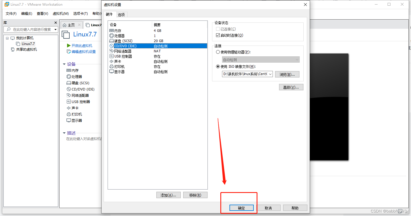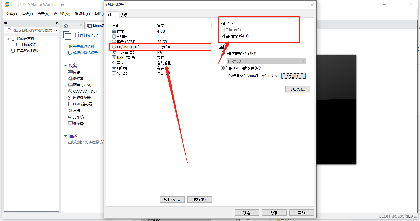 CD/DVD选择设备状态要勾选启动时连接