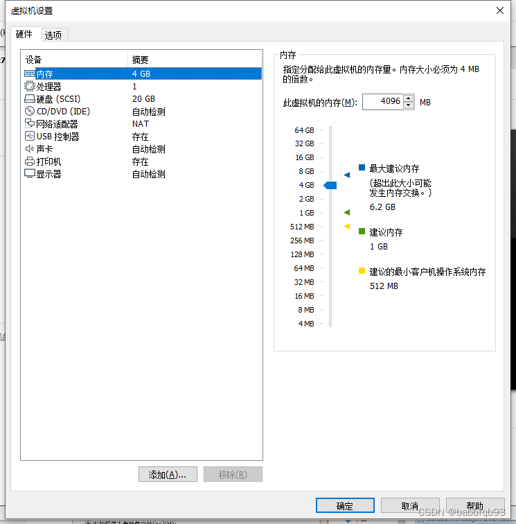 弹出当前设置页面,内存可以选择4GB,处理器1-2个,网络使用NAT,磁盘可以选择20GB,他不会你选择了20GB就立马占用20GB,还是根据你自己使用情况来真实占用,最后配置CD/DVD