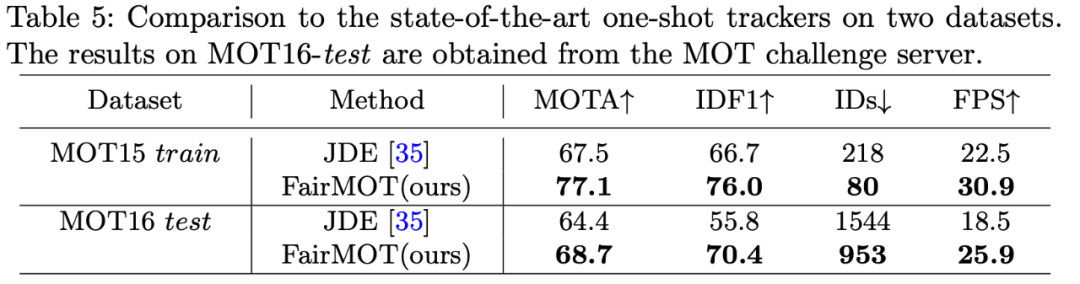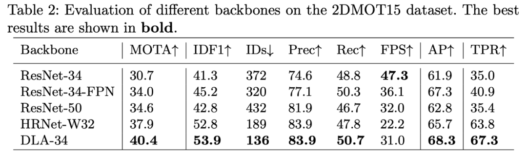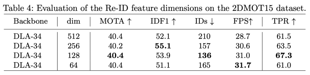表 4:不同 Re-ID 特征维度在 2DMOT15 数据集上的评估结果