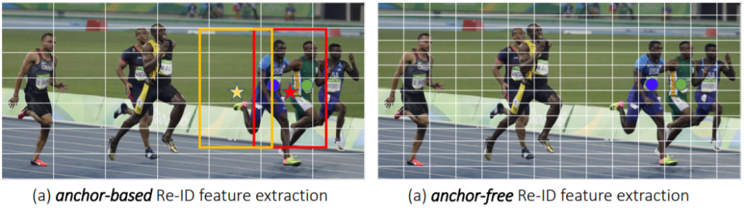 图1:(a)黄色和红色的锚点造成了估计相同的ID(穿蓝色衬衫的人),尽管图像块非常不同。此外,基于锚的方法通常在粗网格上运行。因此,很有可能在锚点(红色或黄色星形)提取的特征未与对象中心对齐。(b)免锚的做法受歧义的影响较小。