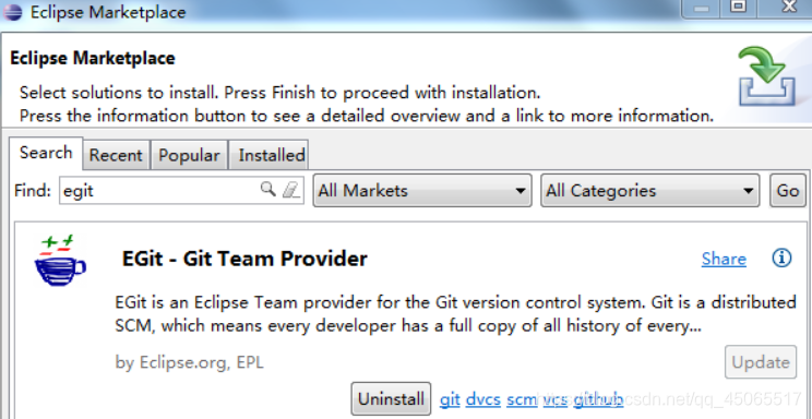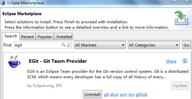 注:如果没有这个插件的,Eclipse需要安装egit插件,在Eclipse中选择help ——> Marketplace,在search中输入egit,找到后安装即可。