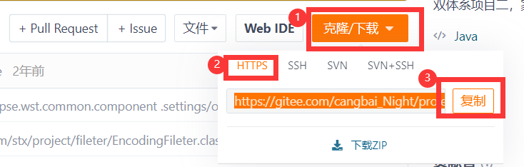 3.然后在github上找到自己所需要下载的项目,把他的URL路径复制下来。有三种导入方式HTTP、SSHGit 、Read-Only。