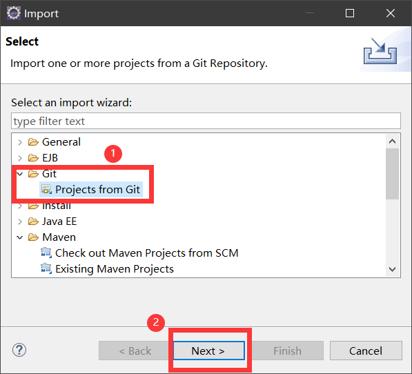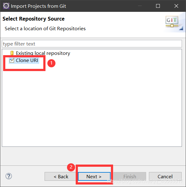 4.点击左上角文件file,选择导入import,找到Git选择Projects from Git,点击下一步Next,选择Clone URL,点击下一步Next。