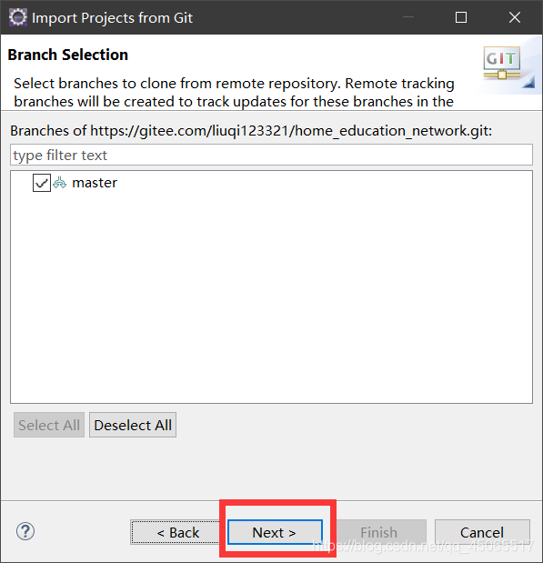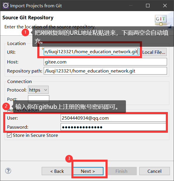 5.把刚刚在GitHub上复制的URL地址粘贴进来,再输入我们注册GitHub的账号密码,点击下一步Next。