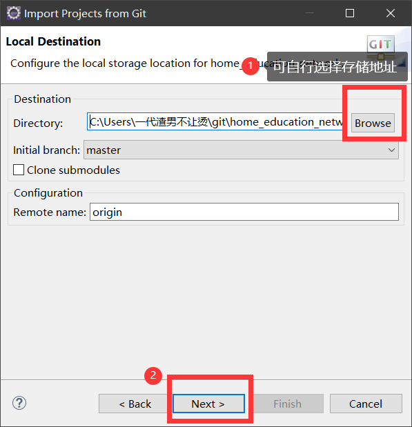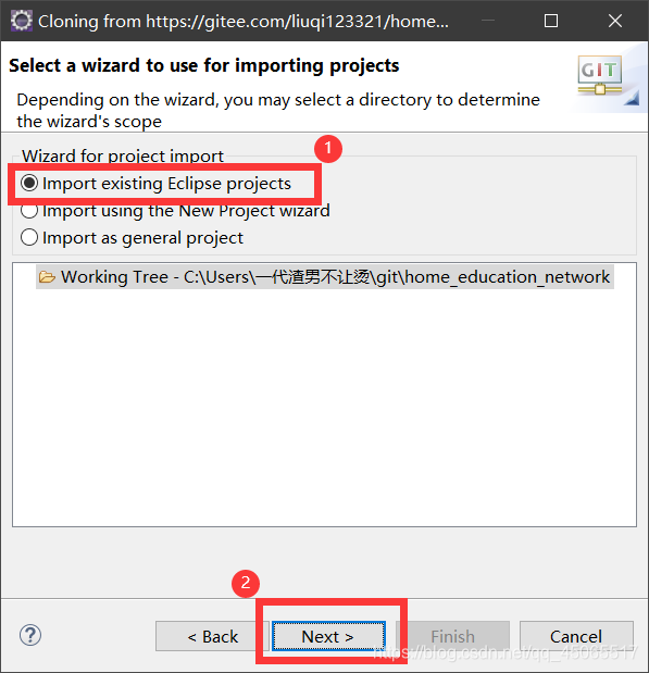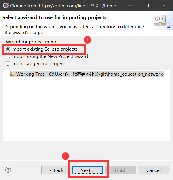6.我们可以自行选择存储地址,也可以选择默认,再选择已存在的项目 Import existing Eclipse projects,点击下一步,然后再单击Finish即可在Eclipse中看到导入的项目了。