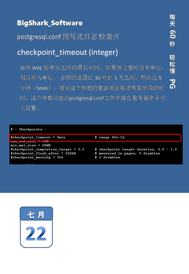 postgresql.conf checkpoint_timeout 版权声明:本文为baidu_24377669原创文章,遵循CC 4.0 BY-SA版权协议,转载请附上原文出处链接和本声明。原文链接:https://blog.csdn.net/baidu_24377669/article/details/118945087