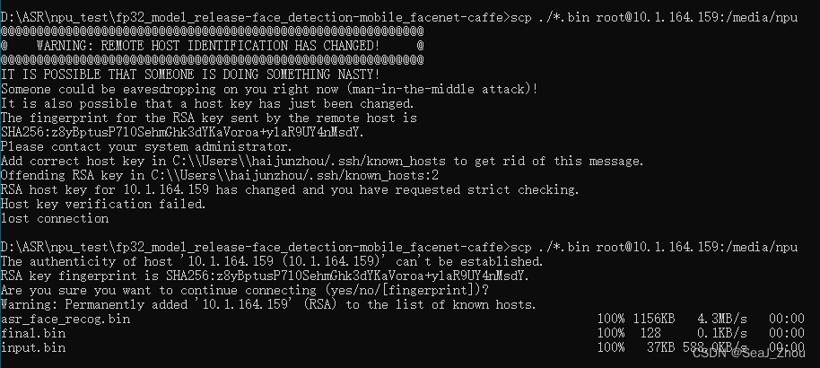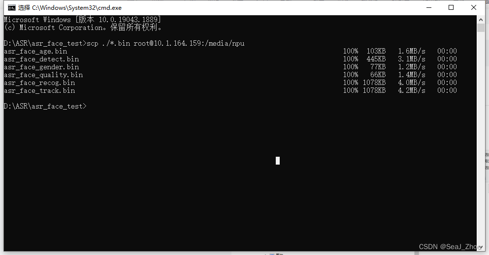 3.Dos中输入scp ./*.bin root@10.1.164.159:/media/npu