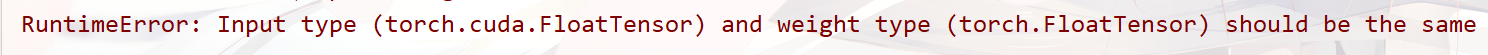 RuntimeError: Input type (torch.cuda.FloatTensor) and weight type (torch.FloatTensor) should be the same报错信息意思是说,我们输入的数据类型与网络参数的类型不符。