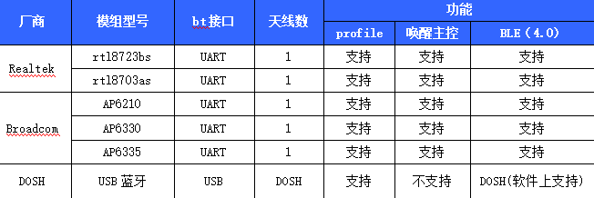 目前H3 android4.4.2平台上已支持的蓝牙模组有6款,其中包括USB蓝牙,支持列表如表