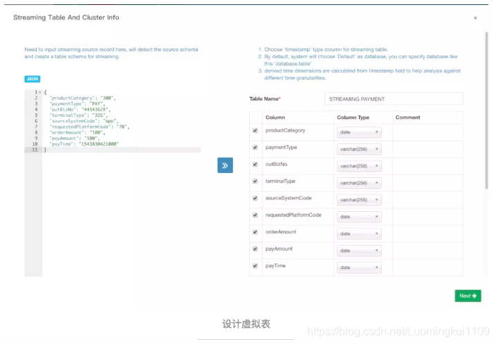 • 写入Kafka中的数据为相同格式的JSON数据,Kylin会从JSON中解析出一张虚拟表,虚拟表中也就是JSON格式的数据中必须包含一个timestamp类型的字段。