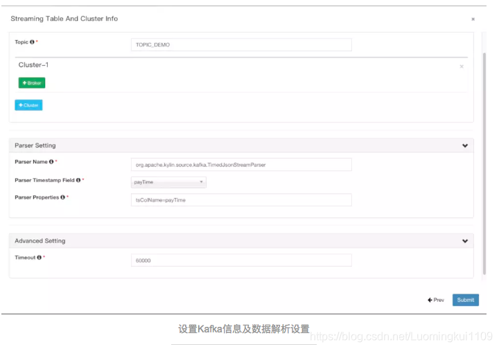 上一步点击Next,进入Kafka和数据解析设置页面,在Kafka Setting区域设置数据所在的Topic和Kafka Broker的集群地址。在Parser Setting区域设置数据解析参数,Parser Name默认为org.apache.kylin.source.kafka.TimedJsonStreamParser,Parser Timestamp Field选择表中timestamp类型的字段,Kylin会根据这个字段的值为自动为衍生时间字段赋值。Parser Properties是根据Parser Timestamp Field自动生成的,这个值会通过构造方法传递给org.apache.kylin.source.kafka.TimedJsonStreamParser。在Advanced Setting区域设置Kylin消费Kafka消息的一些配置参数。设置好上面这些以后,点击Submit就完成了数据源的设置。