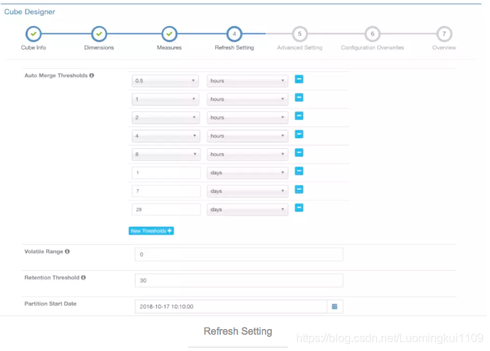Cube的设置跟非流式构建的步骤基本一样,只是在Segment自动合并设置的地方需留意。Kylin的流式构建跟Spark Streaming的思想相似,采用微批量构建,每次微构建都会生成一个Segment。随着时间的推移,Segment越来越多,为了解决每次查询需要提前聚合的Segment越来越多,大量的Segment在HDFS上产生了大量的小文件等等问题,我们需要进行Segment的细粒度自动合并。