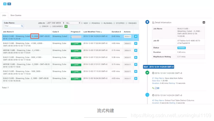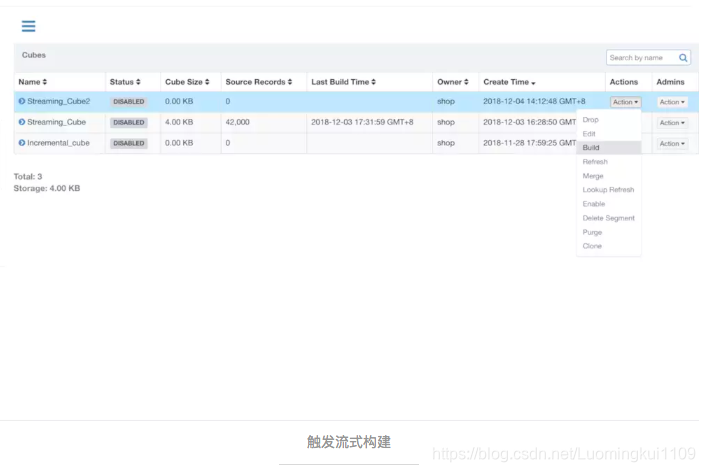 完成了上面设置以后,数据也源源不断投递进Kafka中,这时候就可以触发流式构建了。在Kylin WebUI页面,我们点击build,就会触发一次流式构建。