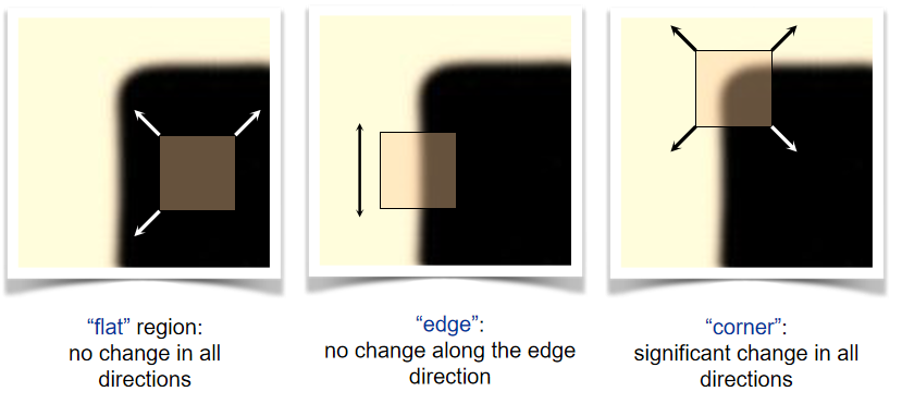 文献[1]给出了寻找这些角点的方法——定义一个窗口,任意方向小幅度滑动该窗口,如果亮度的变化大,那么角点就在其中。