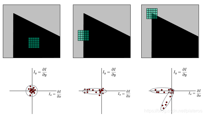 考虑上面所说的三种情况,flat, edge, corner. 下图可以看出Ix, Iy的相应分布。