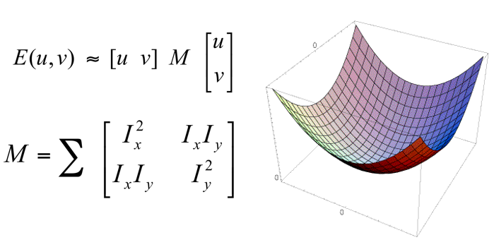 假设窗口W,滑动距离为(u, v),定义一个SSD"误差"E(u, v),我们要寻找的就是能使E(u,v)在各个方向都尽量大的窗口。