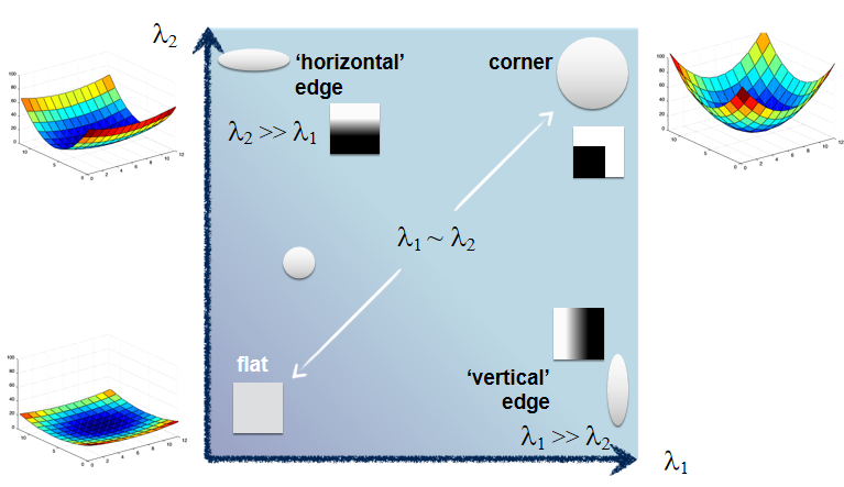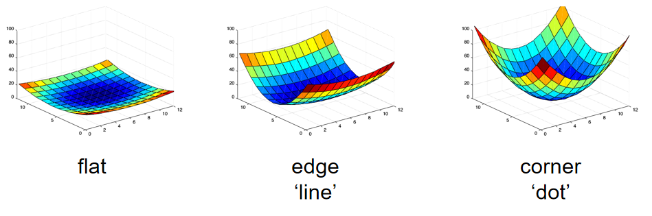 flat, edge, corner的二次型图形表示如下,可以看到coner的形状,E(u,v)在各个方向上的值均较大,