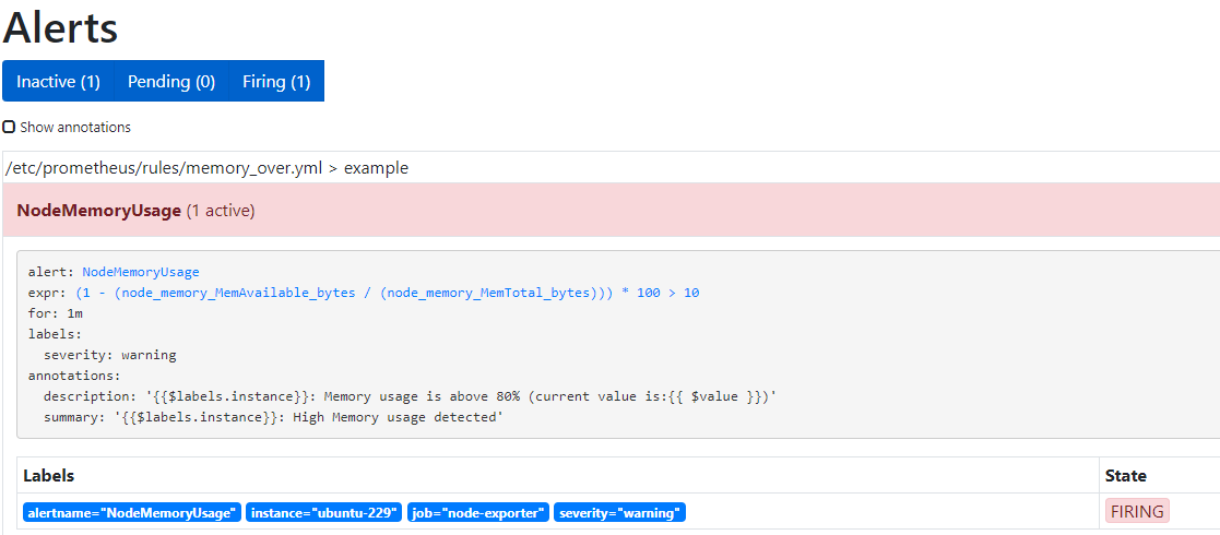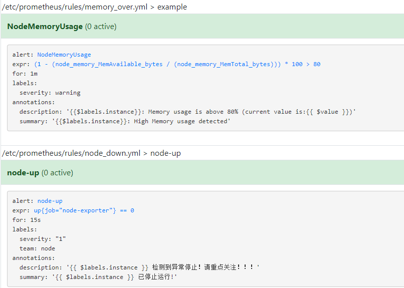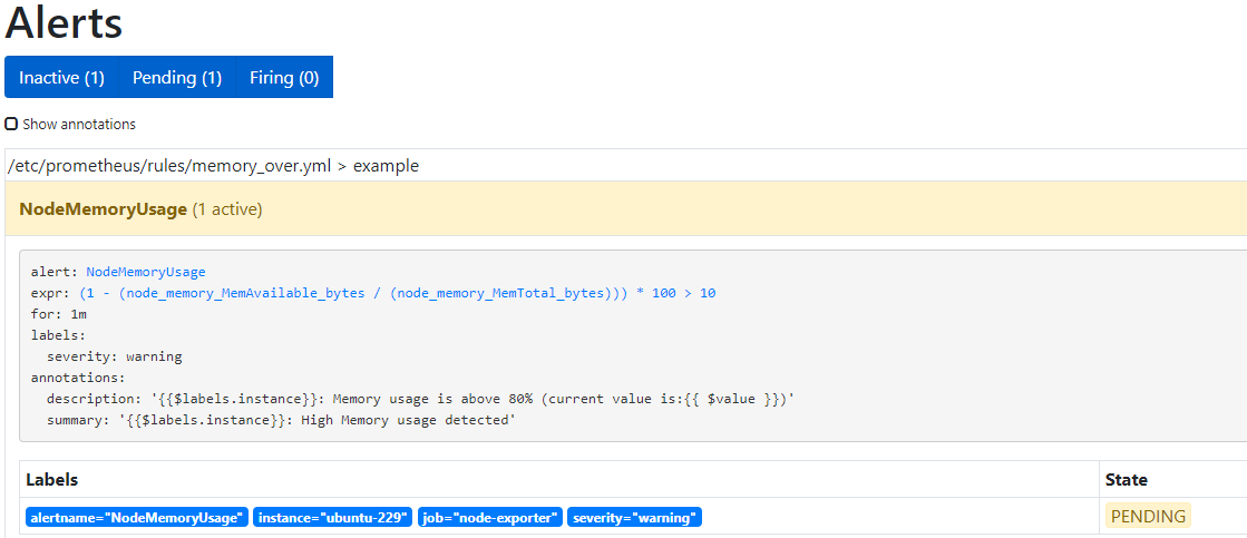 description: "{{$labels.instance}}: Memory usage is above 80% (current value is:{{ $value }})"expr 是计算公式,(1 - (node_memory_MemAvailable_bytes / (node_memory_MemTotal_bytes))) * 100 表示获取内存使用率。