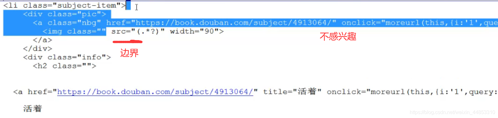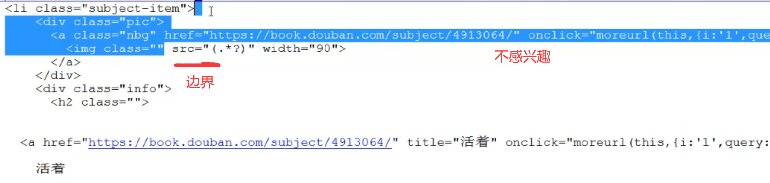 2.找边界,找到能唯一标识的字符串边界,前面或后面的东西不要了换成 .*? 边界留着。