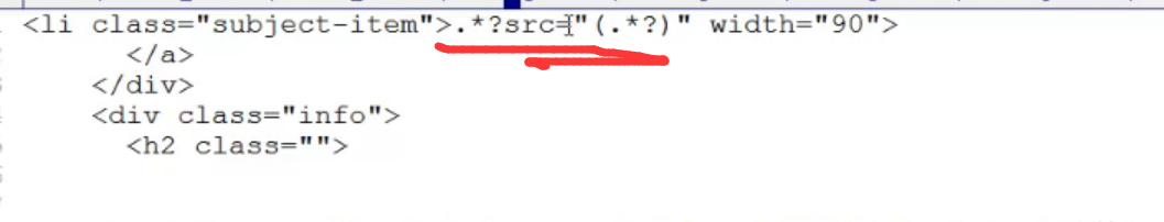 String regex = "<li class=\"subject-item\">.*?src=\"(.*?)\".*? <a href=\"(.*?)\" title=\"(.*?)\".*?<div class=\"pub\">(.*?)</div>.*?<span class=\"rating_nums\">(.*?)</span>.*?<p>(.*?)</p>";
