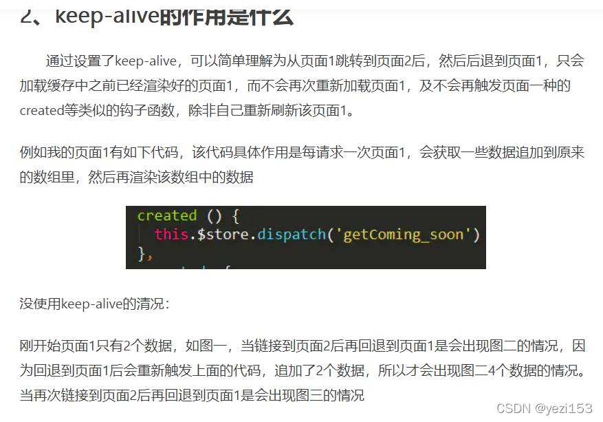 keep-alive用来缓存组件,避免多次加载相应的组件,从而减少性能消耗,简单来说就是从页面1链接到其他页面后回退到页面1不用在重新执行页面1的代码,只会从缓存中加载之前已经缓存的页面1,这样可以减少加载时间及性能消耗,提高用户体验性,不会触发该页面的created钩子函数。