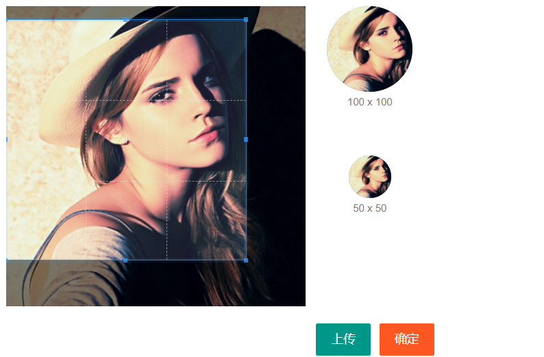 <!-- 第一行的图片裁剪和预览区域 --> <div class="row1"> <!-- 图片裁剪区域 --> <div class="cropper-box"> <!-- 这个 img 标签很重要,将来会把它初始化为裁剪区域 --> <img id="image" src="/assets/images/sample.jpg" /> </div> <!-- 图片的预览区域 --> <div class="preview-box"> <div> <!-- 宽高为 100px 的预览区域 --> <div class="img-preview w100"></div> <p class="size">100 x 100</p> </div> <div> <!-- 宽高为 50px 的预览区域 --> <div class="img-preview w50"></div> <p class="size">50 x 50</p> </div> </div> </div> <!-- 第二行的按钮区域 --> <div class="row2"> <button type="button" class="layui-btn">上传</button> <button type="button" class="layui-btn layui-btn-danger">确定</button> </div> - 样式CSS:
