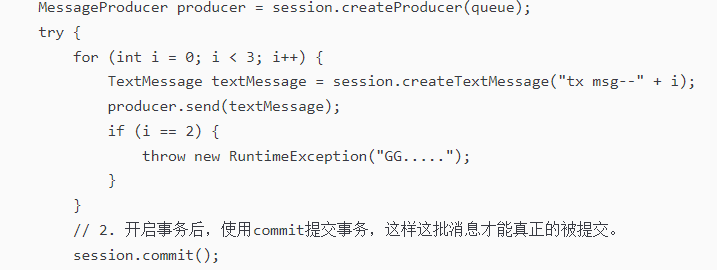 // 3. 工作中一般,当代码出错,我们在catch代码块中回滚。这样这批发送的消息就能回滚。