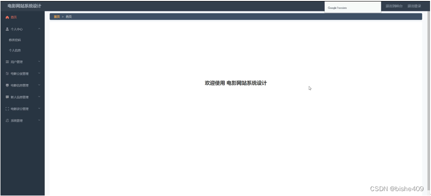 管理员登录进入电影网站系统设计可以查看首页、个人中心、用户管理、电影分类管理、电影信息管理、影人信息管理、电影评分管理、系统管理等信息,如图4-8所示。