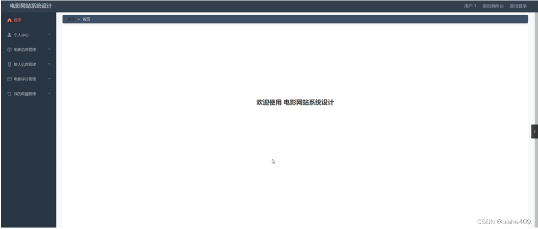 用户登录进入电影网站系统设计可以查看首页、个人中心、电影信息管理、影人信息管理、电影评价管理、我的收藏管理等内容,如图4-15所示。