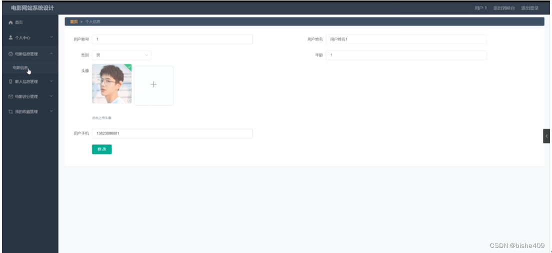 个人中心,在个人中心页面中通过填写用户账号、用户姓名、性别、年龄、头像、用户手机等信息进行修改,如图4-16所示。